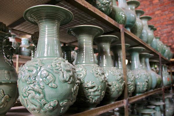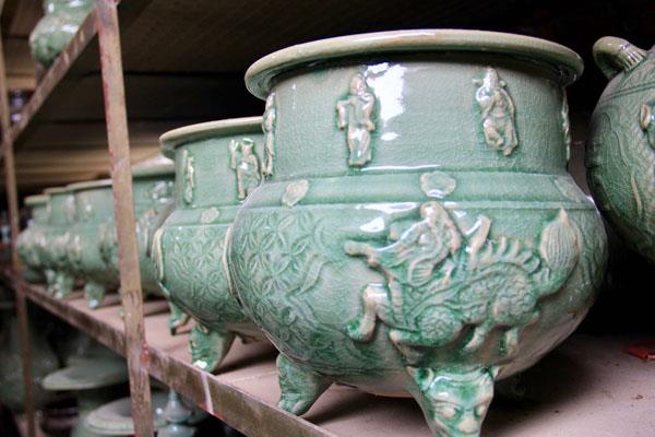 许家父子他们的作坊目前占地有一亩,有工业窑、仓库、陈列室。在他们的作坊里随处可见各种造型、各种颜色的陶瓷成品,真是琳琅满目、叹为观止。居多的是花瓶,除此之外有香炉、碟、盆、宝塔、观音像等等。这些成品上还雕刻着各种丰富的图案,有十二生肖,有龙飞凤舞,有八仙过海,还有牡丹、白梅等花卉………颜色也很多,有黑,有白,有蓝,有金,有茶,有绿等等。据许家父子自己介绍,他们以做高端艺术品为主,主要是做欣赏收藏类的仿古陶瓷。各种仿古陶瓷他们都会做,如三国的黑釉、南北朝的棕瓷、唐三彩、唐青花瓷,北宋的龙泉青瓷等等。其中数龙泉青瓷的冰裂釉最难做,但也最具观赏与收藏价值。冰裂釉是釉片内有像雪花般裂开的花纹,若隐若现,在碧绿色的釉面下闪着神秘的光泽。