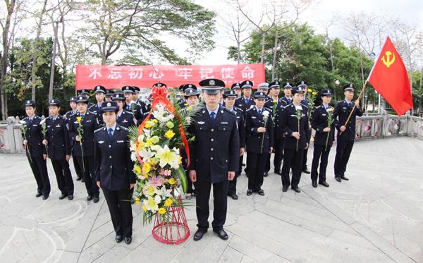 本报讯 为深切缅怀革命先烈及公安英烈。清明节前夕,涵江公安分局50多名青年民警来到闽中革命烈士陵园开展“弘扬英烈精神、做党的忠诚卫士”活动。在烈士陵园,全体民警向烈士纪念碑敬献花篮,脱帽默哀3分钟,并向革命先烈们及公安英烈们三鞠躬,接着,青年民警逐一将鲜花放到碑前,表达对英烈的思念及敬意。随后,青年党员民警在纪念碑前重温入党誓词。图一为青年党员民警在纪念碑前重温入党誓词。图二为分局青年民警怀着崇敬的心情,带着深切的思念来到闽中革命烈士陵园开展“弘扬英烈精神、做党的忠诚卫士”活动。 (梁东红)