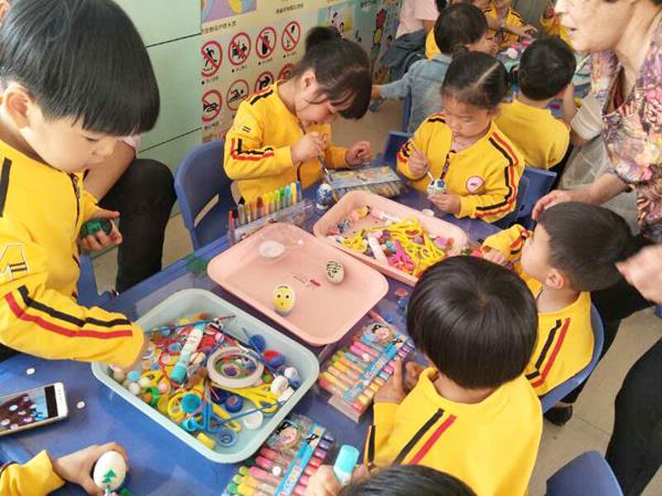 中班的每个小朋友手里都有一个熟鸡蛋。小朋友们一个个和家长们商量着制作什么样图案的彩蛋,一起动手用彩绘的方式制作出一个个美丽的彩蛋。不一会儿,小朋友就用彩笔把鸡蛋变成了一个个可爱的小动物、有趣的卡通脸,还有小树等,趣味无穷。