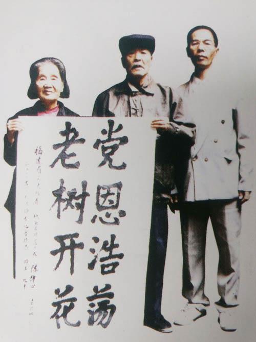 ▲陈禅心先生手书“党恩浩荡,老树开花”,表达自己对中国共产党的感恩之情,同时也表达暮年壮心不已、继续奋斗的心迹。图为陈禅心夫妇及三儿陈季衡(右)在书法条幅后合影。