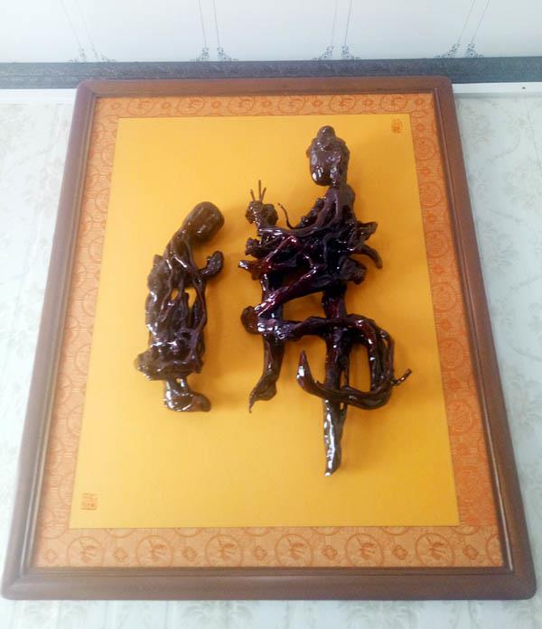 树根字可以说是一项在莆田传统的根雕技艺上,将根雕与书法相结合的创新艺术作品。树根字,利用树根的天然形态,即弯曲、枝杈、疤节等,经选取、拼接、组合、磨光、涂色、上漆加工粘贴成字。但必须严格符合行草书法的规则,是书法艺术的立体化表现。树根字将行书、草书的飘逸灵动表现得淋漓尽致,生动形象,具有观赏和收藏价值。