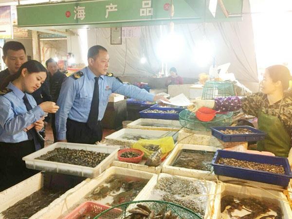 图为龙桥食药监所执法人员在辖区农贸市场检查现场,向食品经营企业发放“食品安全”和《食品安全法》相关知识的宣传资料。 (舒易刚)