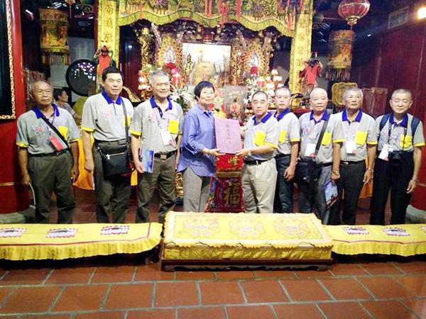 文峰宫管委会组织执事队伍恭迎进香团绕境踩街,组织进香团向文峰宫妈祖行三献礼,参观文峰宫历史文物,让台湾信众进一步了解文峰宫悠久的历史文化积淀。陈鹭玲代表文峰宫向进香团赠送妈祖画册《妈祖圣迹图》。 (郑协)