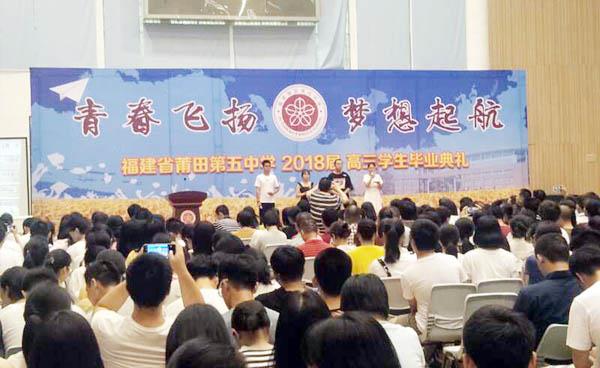 本报讯 6月10日上午,莆田第五中学的体育馆内掌声阵阵,欢声笑语,2018届高中毕业典礼《青春飞扬 梦想起航》在这里举行。学校领导班子成员和高中毕业班全体师生及2018届961名高三毕业班学子和部分家长参加了典礼。