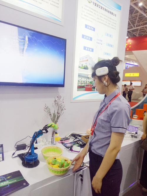 胡智华举了个例子,假如一个脑中风的患者或者肢体残疾人士,他想要抓取某样东西,就可以通过装上意念机械臂,实现手部的很好的抓紧功能,从而改善他的生活质量。在工作人员的辅助下,体验者戴上便携式脑波采集仪后,随着双眼紧紧盯着要抓取的物品,不一会儿,意念控制机械臂就将一个小筐内的物品抓取起来放置到另一个小筐内,围观者不由得爆发出阵阵惊呼。