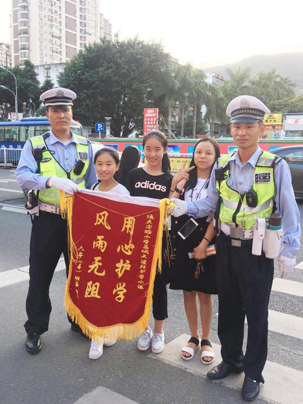 6月28日下午,逸夫实验小学六年4班卓尔和同学将一面写有“用心护学 风雨无阻”的锦旗送到荔城大道护学小组两位护学岗民警陈碧海和志彬手中,对警察叔叔一直以来全力维护学校周边道路交通秩序表示感谢。真情流露懂感恩,爱生民警人人夸。