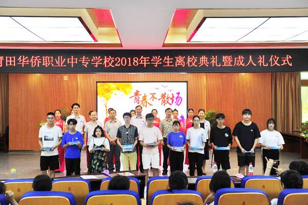 6月26日,莆田华侨职业中专学校2018年学生离校典礼暨成人礼仪式在学校报告厅隆重举行。该校校长蔡建华、党支部书记林国钦、副校长朱国粦、陈春芳、陈华斌、工会主席刘映昕、学校中层行政干部、专业科负责人、班主任和2016级全体同学一起,见证了一场永不散场的青春盛典。