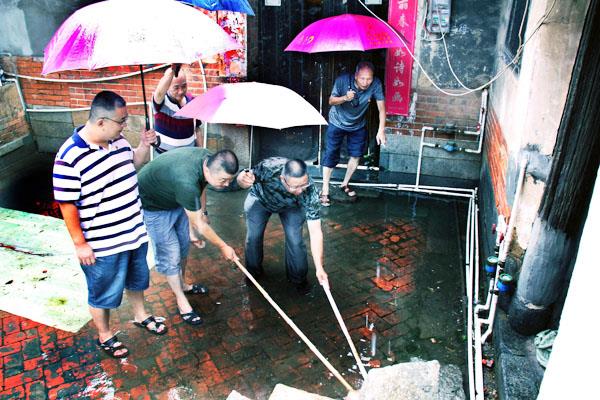 图为社区党员干部在新桥巷一古屋大院中,为居民群众清理阴沟、疏通积水。 (筱麦)