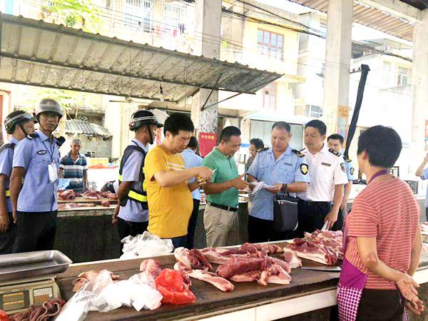 图为市委巡察组工作人员,深入由龙桥食药监所组织,与农业、常太食安办在常太市场,联合开展严厉打击经营危害肉品质量安全违法违规行为“百日行动”活动现场,认真检查核猪肉经营者索证索票等相关资料。 (舒易刚 田野)
