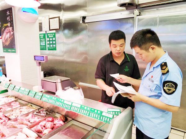 图为黄石食药监所执法人员在辖区内某肉品生鲜超市进行生鲜猪肉专项检查。 (黄林伟)