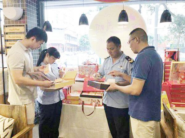 图为龙桥食药监所执法人员,在国庆中秋期间食品安全整治现场,认真核查月饼的相关信息。 (舒易刚 凌明信)