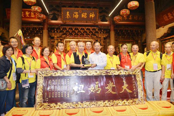 林金赞董事长代表祖庙董事会赠予妈祖油画,两岸三地心缘团赠送祖庙刻有“大爱妈祖”匾额留念。 (黄美珍/文 高亚成/图)