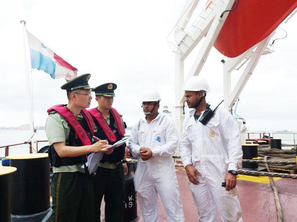 本报讯 7月17日,在秀屿港,巴拿马籍“密西西比”号外轮正紧急卸载从巴西巴拉那瓜港进口的5.4万吨大豆。负责该口岸出入境检查的莆田边防检查站24小时驻守港区验放监护,确保外轮第一时间验放入境,第一时间靠泊卸货。图为当天上午,莆田边检官兵正在“密西西比”号外轮上监护巡查。