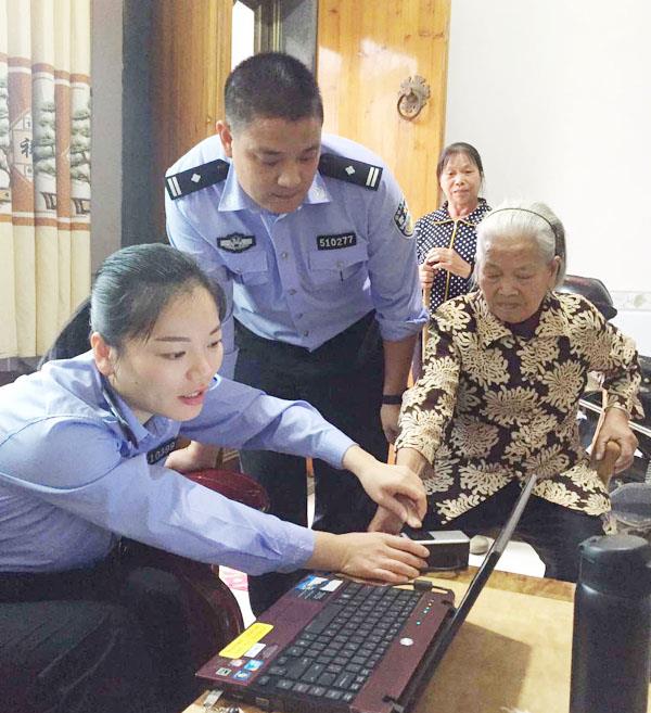 本报讯 日前,常太派出所民警在二维码工作走访中了解到家住在常太镇下莒村的李吓由于名字无法打印出来,导致二代身份证无法更新换代,使得她在住院治病、报销药费等方面遇到诸多困难。了解上述情况后,民警积极向领导请示下乡办理,并主动联系其家属宣传户籍政策及预约办证时间,民警携带办证器材上门办证,为辖区群众变更名字办理身份证。为了确保采集效果,民警细心替老人整理衣装,调整好姿势进行拍照,耐心为其录入指纹,成功办理二代身份证。 (林东霞 林红)