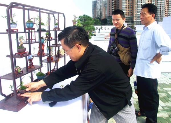 图为微型盆景艺术专家黄山在现场布展。 (陈宝柱 文/图)