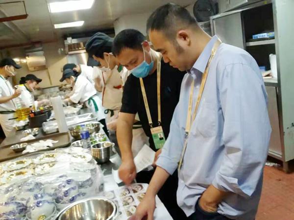 图为驻悦华酒店保障工作人员,现场对“宴会活动”食品安全进行指导并全程监管。 (舒易刚 凌明信)