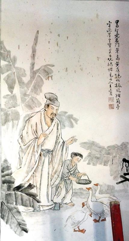 ▲《王羲之爱鹅图》,款识:书圣完名门第高,黄庭绝代振风骚。蘭亭字迹墨皇宝,奚自玩鹅惜一毛。山人秀廷画。