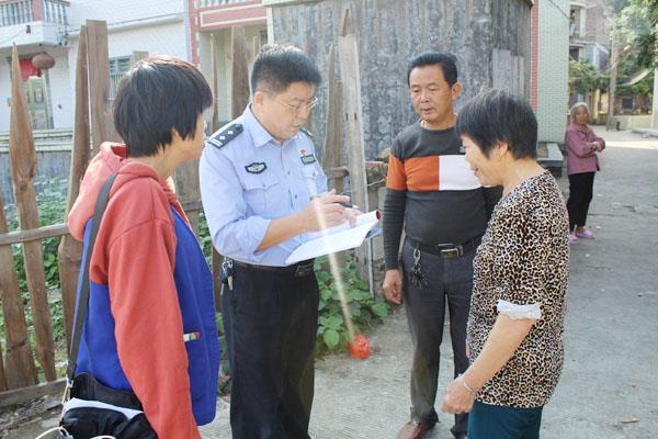 本报讯 日前,仙游县公安局法制大队组织民警前往大济镇三会村开展“扫黑除恶”及平安建设“三率”知识宣传活动。此次活动,以宣传、服务为一体,采取上门入户,挨家挨户发放平安“三率”知识和扫黑除恶宣传单,传递《大济平安联系卡》,并做好一表一户的《入户登记》,现场引导群众面对面关注“美丽大济公众号”“平安仙游公众号”“县公安局公众号”,扩展宣传渠道,加强宣传力度,使广大群众了解并积极参与平安建设活动,让平安建设深入人心。 (邹秋娟 林锦堂)