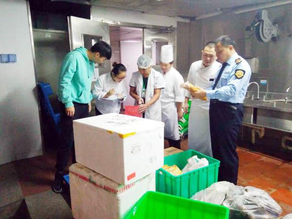图为龙桥食药监所执法人员,在保障现场对酒店采购的食品原材料进行查验。 (舒易刚 凌明信)