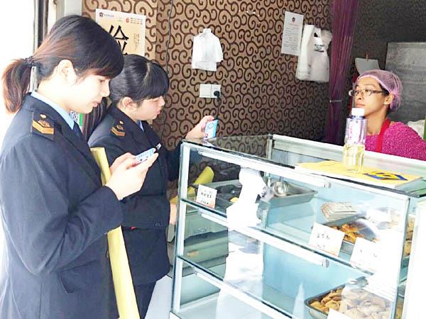 图为龙桥食药监所工作人员,在文明城市创建活动现场,认真核查食品经营企业从业人员健康证信息,并发放张贴宣传材料。 (舒易刚 凌明信)