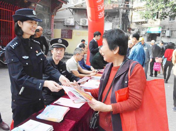 12月4日是第五个国家宪法日。今年活动的主题是“尊崇宪法、学习宪法、遵守宪法、维护宪法、运用宪法”。当天上午,涵江公安分局民警联合有关部门到涵江区中心城区城隍庙广场开展法律咨询及法制宣传活动。民警通过发放宣传材料现场解答形式向群众宣传宪法及法律,向群众讲解日常安全防范常识及扫黑除恶举报奖励公告。 (梁东红)