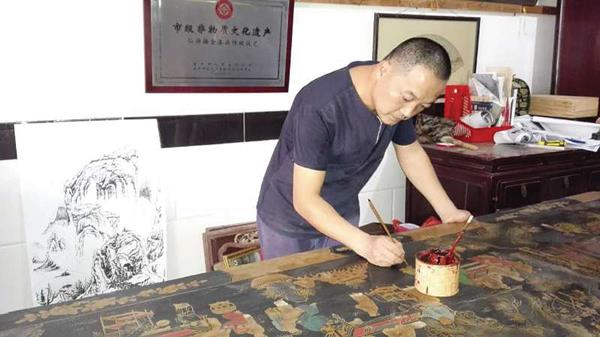 其实,除了制板、描漆、贴金,最考验技艺的是最后的开脸和线条勾勒。在琴桌、屏风、挂屏、牌匾、漆瓶、漆盘等漆画精品琳琅满目的礼耕堂里,傅振文使用笔尖小而硬的铁笔,在人物脸部先勾勒出五官。之后,精心勾勒人物线条,将漆膜刻透至黑色磨光漆板,精致刻画出细小而有力的线条,着重调节明暗,使画面富有立体感。傅振文颇有感触地说道,“开脸这个步骤在画面中起到非常重要的点睛作用,要全神贯注,一气呵成,下笔有轻有重,一定要达到传神。如果说一步画错的话,这个部位就要全部修改,包括要把金箔全部抹掉,从头再来,是个看似简单可操作难度挺大的技术活呢!”