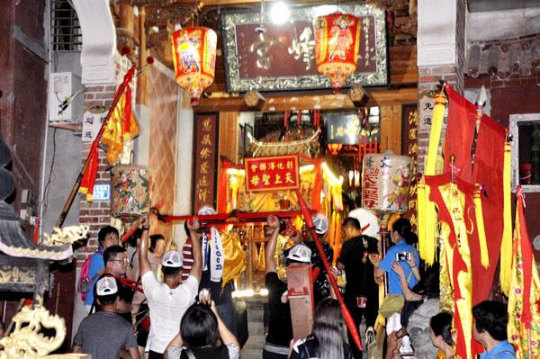 在文峰宫旧殿,台湾信众向文峰宫妈祖行三献礼,并参观文峰宫三代祠、梳妆楼等古建筑,以及宋代妈祖木雕像等文物。 (郑协)