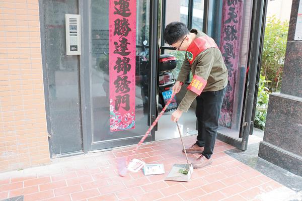 志愿者们亲自动手帮忙物业工作人员打扫卫生、清理楼梯小广告,并巡查了各个电梯楼道,确保电梯间没有杂物堆放,保障小区居民进出安全。