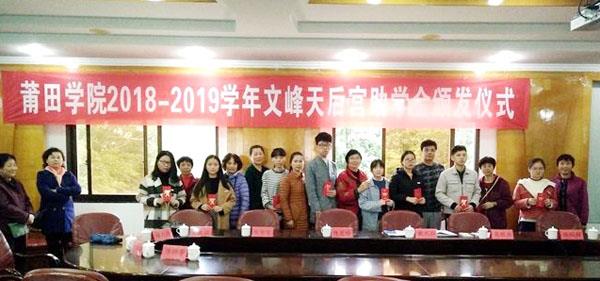 本报讯 12月25日,莆田学院颁发“2018-2019学年文峰天后宫助学金”,16位品学兼优、家庭经济困难的学子每人获助2000元助学金。莆田文峰天后宫管委会主任陈鹭玲带领该宫“妈祖使者”共同为获助学子颁发助学金。
