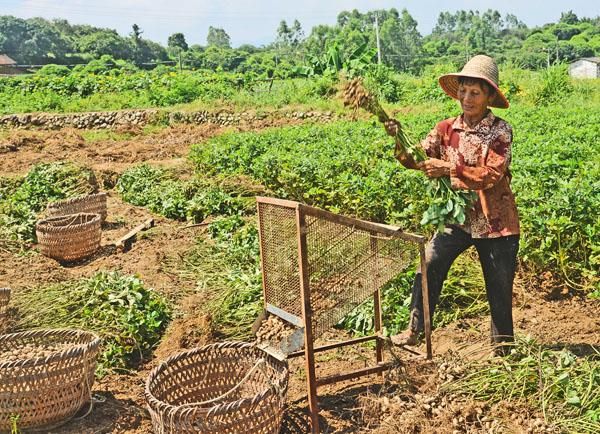 “据气象台预播,近期台风一个接一个很是频繁,大家都很担心,要是台风暴雨来了那就全泡汤了,为了防范于未然,早日做好颗粒归仓不能让劳动的成果遭受损失。”一采摘花生的李姓老人说,“由于今年早季气候平稳病虫害防治及时,年情还比较好,他举起手中的花生,果实累累颗粒饱满,亩产量预计10担(青果)跟往年度相比不会有减产现象。”目前又处于高温天气,在田间里劳作实为难当,为了保护劳动力,他们起早模黑错时下田抢收。 (陈国松)