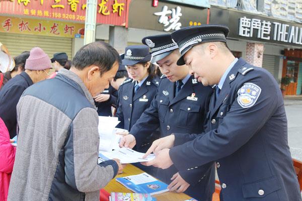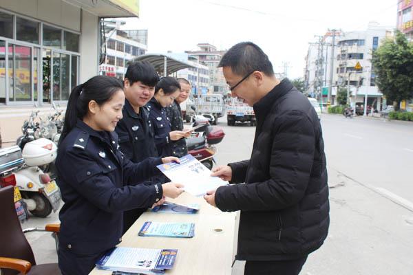 1月10日,黄石派出所组织民警走上街头向群众发放宣传单,现场介绍“110”接处警规则、如何正确使用报警服务电话和提供咨询以及防盗、防骗、防抢、防火、禁毒等法律法规知识,引导辖区群众关心、支持、理解、监督和正确使用。 (欧倩)