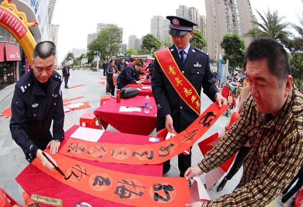 又讯 1月10日至11日,福建省公安厅公安书法小分队及莆田市公安局涵江分局民警在涵江隆恒时代广场开展“福建公安书法家送万‘福’进万家”义务撰写春联活动,慰问基层一线公安民警和社区群众。图为:书法家挥毫泼墨,书写春联。(梁东红)