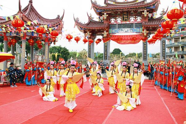 2月13日(农历正月初九),侨乡江口镇石庭铁山通凌殿举行盛大的玉皇大帝祭典仪式。这场独具特色的祭典,富有浓郁的莆仙民俗宗教色彩,村民群众们用另一项娱乐形式为当地庆元宵活动带来欢乐的气氛。图为石庭铁山通凌殿祭典场面。 (子木)