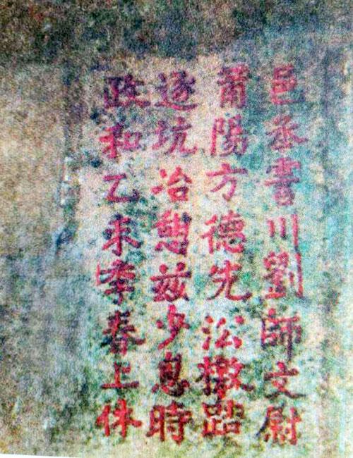 位于长乐市江田镇江田村灵峰山上归云洞内壁。摩崖高85厘米,宽50厘米。纵4行,楷书:“邑丞霅川(浙江吴兴县别名)刘师文、尉莆阳方德先,沿檄踏逐坑冶,憩兹少息。时政和乙未(政和五年,1115)季春上休。”