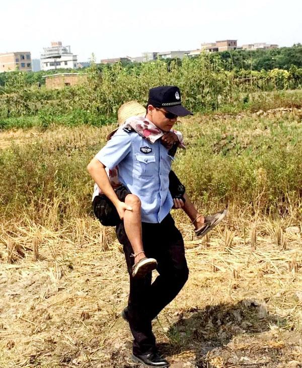 “您不能再这样任烈日暴晒下去,来,我背您回家!”卢烟表迅速让老人趴在自己的背上,背着老人往路边走去。由于田地凹凸不平,杂草丛生,短短六百米的路程也走得很艰辛。汗水不停从他的脸颊滑落,身上的警服也早已湿透,终于,他把老人送上警车,一路疾驰开往象山村村部,希望能了解到更多关于老人的情况。