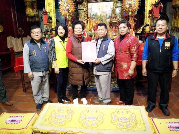 图为文峰宫管委会向台湾圣母三妈文化交流协会赠送《妈祖圣迹图》画册。 (郑协)