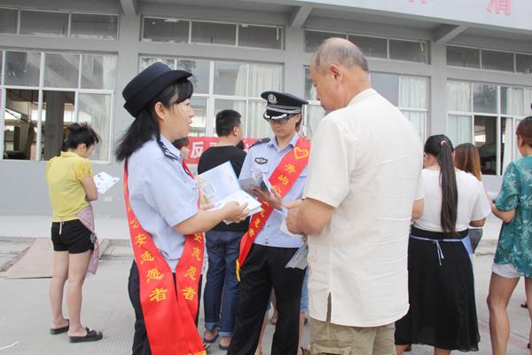 近日,秀屿公安分局组织8名志愿者民警,利用周末休息时间,深入到秀屿辖区雨晨鞋业有限公司等3家企业,开展“反邪教”法律知识宣传。图为民警通过问答形式,向企业员工详细讲解“反邪教”法律法规、政策规定等相关知识。 (周金赞 严婷婷)