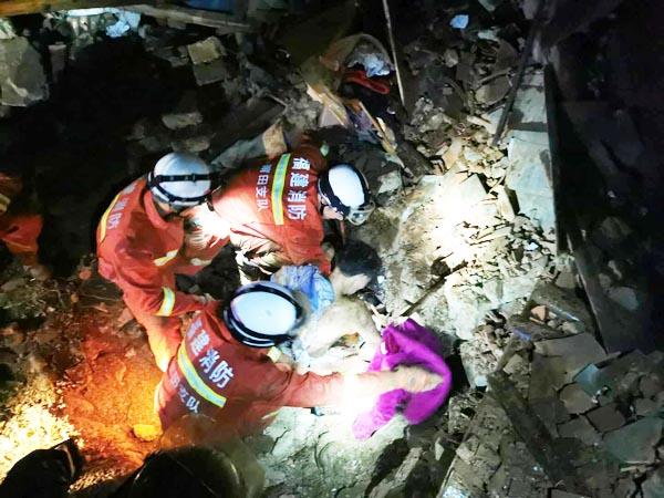 到达现场后,坍塌房屋为一栋两层土木结构房屋,因下雨天房屋地基不稳,导致房屋部分坍塌,一名男子被埋,经过现场勘察,被埋男子周围为泥土木板,不适用大型器材进行救援,消防员就徒手开展救援,现场设立安全员进行观察周围情况,其他人员进行接力徒手清理被埋人员周围的障碍物,一边与被埋人员聊天转移注意力,一边进行救援,经过消防指战员的两个小时的徒手救援,终于成功将该男子救出。