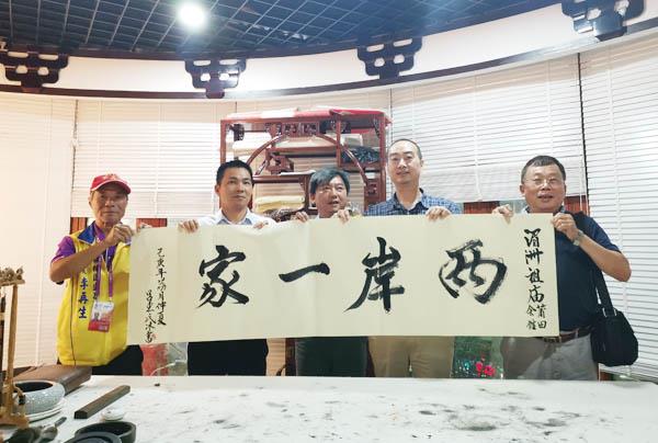 黄愈丰一行希望通过考察交流,加深了解,加强合作,寻找商机,合作共赢。双方互赠纪念品,来宾中的台湾书法家还即兴书写“两岸一家”题赠妈祖会馆。