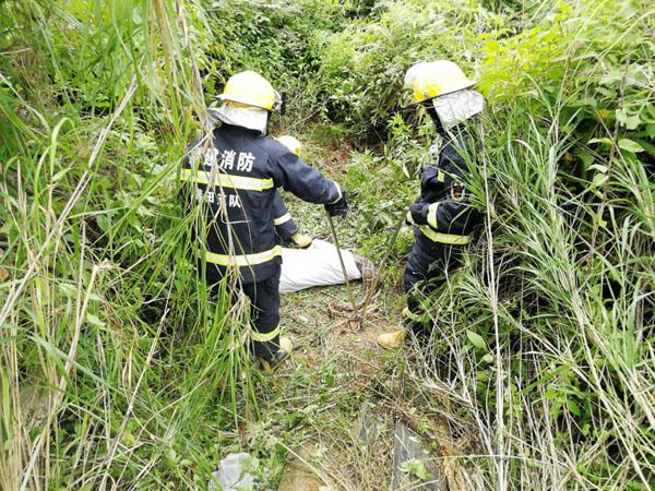 本报讯 6月21日,莆田市消防救援支队仙游大队接到榜头镇后坂村一村民报警称,他昨日发现自家刚出生的牛犊不见了,便四处寻找,结果发现草丛里躺着一条巨蟒,顿时吓得浑身发软,因为害怕这条蟒蛇具有攻击性,不敢轻举妄动,只好报警求助。接到报警后,消防指战员立即组织赶赴现场,经过摸索、查看观察发现蟒蛇体型硕大,刚捕食完正在酣睡,肚腹处撑得老大,最宽的地方大概有半米多宽。