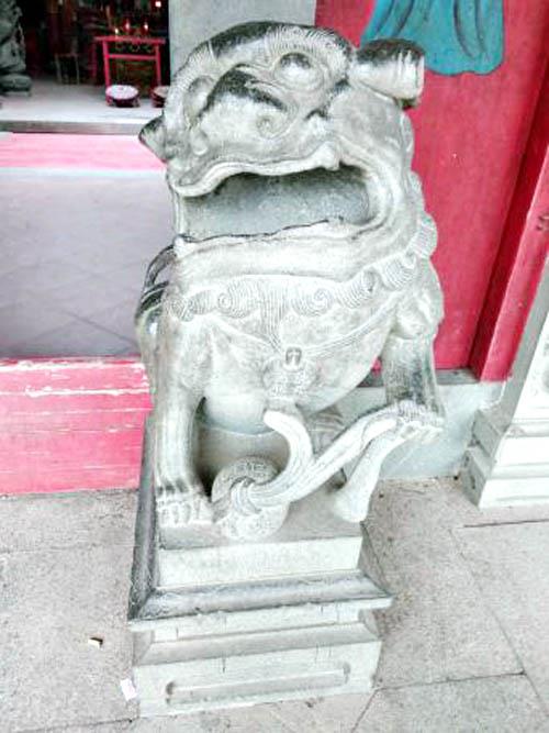 这对石狮,一公一母,嘴角上翘,露出笑意,显顽皮诙谐劲,成为南派石雕艺术象征性之一的珍品,两百多年前一直蹲坐在南潮宫的门边。它们忠厚诚实,尽心尽责,憨态可掬,逗人喜爱。不论客人来自何方,它们都会热情相迎,真诚相待。不管你是何时见到它们,它们永远笑口常开。门边有一对浮雕楹联“庙对砺山观虎变,灵沼潮水庆龙兴”,这是清代嘉庆年间大理寺卿、书法家郭尚先的手迹,笔法“龙筋虎骨”,十分遒劲有力。可能会有人发问:为什么石狮要放在门口?可有谁会联想到以狮制虎,守护人们的民间传奇之典故。这样,龙鸣狮吼,和谐相伴,相得益彰。