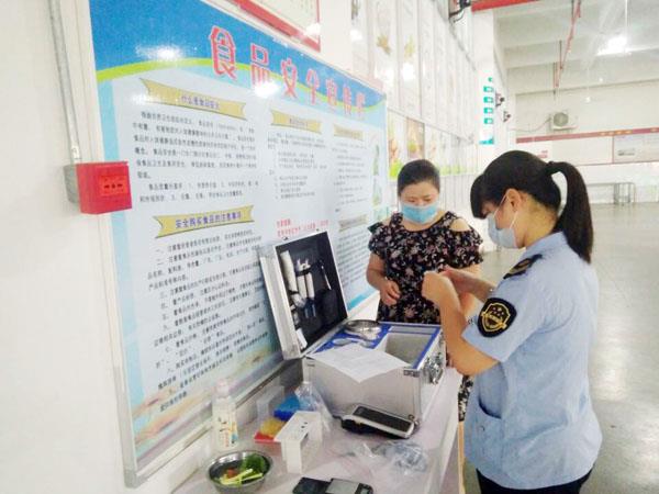 图为龙桥所执法人员,对学校食品原材料进行随机快速检测,把好食品安全采购关。