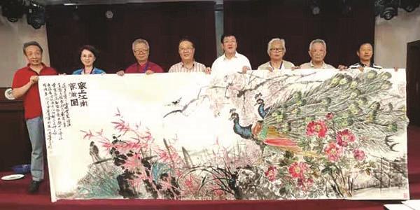 宁夏是福建的帮扶省份,两省的文史馆有长达二十多年的深谊。2019年7月8—12日,为了庆祝国庆70周年和宁夏解放70周年,宁夏文史馆邀请全国25个省的文史馆派人赴银川出席“贺兰雅集”。福建省派了方纪龙等四人。九日上午,画展隆重开幕。莆籍诗人、书画家方纪龙参展的作品是《桃鹤图》。下午举办笔会,八个馆的花鸟画家合作创作一幅三米多的巨画。此画由方纪龙总体设计并开笔,他画的是孔雀。