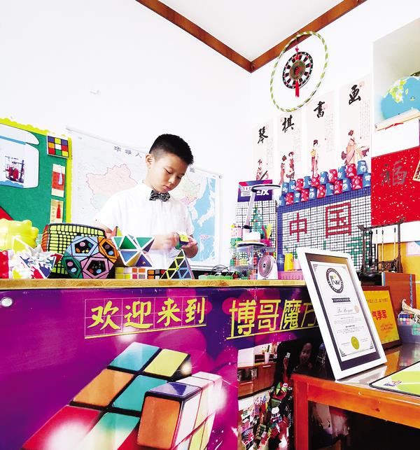 “3.14159265358……”付博焰一边背圆周率500位一边还原魔方。刚一见面,付博焰就给记者展示了魔方的不同玩法。“魔方玩法繁多,基本目的是把打乱的模块迅速还原。”他一边娴熟地转着一边轻松地说,“我不仅会边玩魔方边背圆周率和世界国家名称,还会单手复原魔方单手摇迷你色子魔方!”只见付博焰灵活的手指上下翻飞,伴随着“”咔咔咔”的旋转声,1个完全被打乱的魔方半分钟内,就在单手的操纵下复原而且另一手的5个魔方色子也竖立起来……,在付博焰家中,记者见到了陪他一起成长的大大小小近百个魔方,它们造型各异,颜色多样。付博焰年纪虽小,却已是一个自信大方、气场十足的帅小伙,并且在他的魔方世界闯出了一片天地。之后,他又展示了解如何数字华容道,用了很少的步数,不到16秒,就将棋盘上散乱的数字方块,按照从左到右、从上到下的顺序重新排列整齐了。