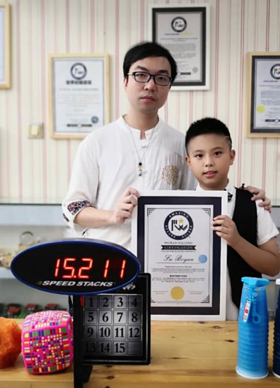 近日,莆田10岁学生付博焰在福建省厦门市鹭江公证处公证人员现场监督下,成功完成了4×4数字华容道纪录挑战,用时15.211秒。打破第五季最强大脑何猷君21秒的纪录,成功创造“最快时间解数字华容道”世界纪录。同时他还斩获中国达人秀厦门赛区决赛冠军,成功晋级并拿到直通卡,顺利进入即将在上海举行的总决赛。