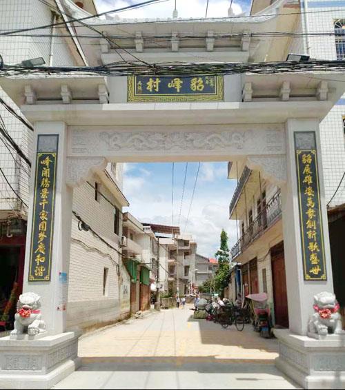 其实,思乡心切的他早在1990年就为吴氏宗祠重修带头捐资贰万元。好家风代代传,“上贤下仿”,1996年吴嘉模孙儿吴建立慷慨捐资5万元作水泥硬化主村道;2000年,吴嘉模的孙儿吴建立继承祖父爱国兴学的传统,捐款人民币壹万元续建嘉模教学楼第三层;2007年,吴建立又乐捐五万元修缮嘉模教学楼。此外,2018年,吴嘉模的孙儿吴建立夫妇共捐人民币二十五万元建造貂峰村牌坊,如今现在这座堂皇富丽的貂峰村石大门(图2)矗立在三郊省道的貂峰路口,真是“貂展雄姿万众创新歌盛世,峰开胜景千家圆梦庆和谐。