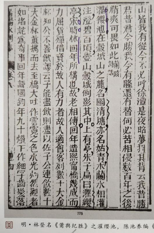 清代黄海撰《续莆阳比事》卷六,4页载:“宋濯缨亭故址,朱子手书‘天光云影’墨迹犹存。”(福建省图书馆藏) 图/李智强提供