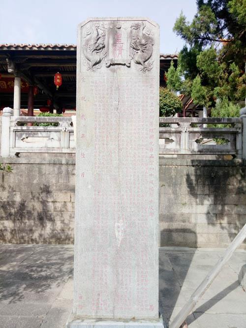 此碑高294厘米,其中碑额高59厘米,篆书“皇清”二字,碑身高235厘米,宽82厘米,厚14厘米。存立梅峰寺天王殿后广场上。