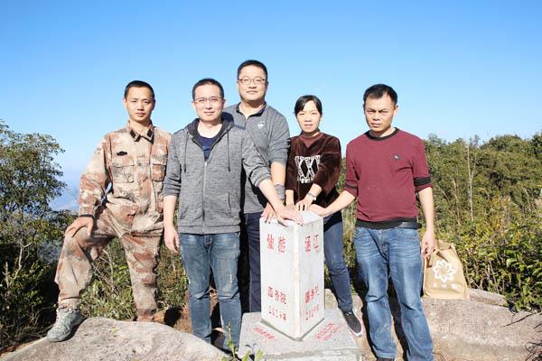 沿着蜿蜒崎岖的山路行进了两个多小时后,工作组一行来到涵江区庄边镇山溪村下田自然村,由于此行的目的地位于人烟罕至的山脊上,大家只好弃车步行前往。进入林区,映入眼帘的是翠绿的竹林,茂密的植被和各种奇花异草,回荡在耳畔的是溪水潺潺声,清脆的鸟鸣声,仿佛置身于一幅美丽的山水画中,令人心旷神怡。尽管风景如画,但大家无心停下欣赏身边的美景,脚步匆匆赶往目的地,大家深一脚,浅一脚艰难的行进着,或踏着厚厚的落叶,或踩着羊肠般大小的斜坡,或俯身钻过横卧的树干,渴了,停下喝口水,累了,席地休息,汗水在大家身上湿了又干,干了又湿,三个多小时的翻山越岭和一路劈荆斩刺,中午1时许,大家终于顺利到达目的地。成功登顶后,大家已是饥肠辘辘、汗流浃背,顾不上看一眼山峰美景,取出随身携带的饮用水和面包等干粮充饥后,又马不停蹄的寻找界桩位置,核对坐标、拌水泥、挖坑、树界桩、描红……大家齐心协力又分工明确,经过两个小时的协作,一座全新的、标准化的边界界桩矗立在仙游、涵江、永泰三县(区)边界的山脊顶上,在阳光的映衬下,新的界桩显得十分庄严、夺目。