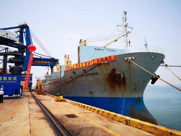 图为罗屿港铁矿石对台首航,中国台湾籍“通捷”轮,正在装载27500吨的铁矿石。